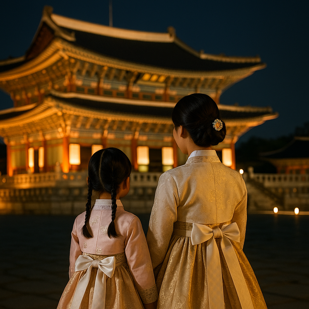 한복 입고 걷는 밤의 궁궐, 은은한 조명 아래 추억을 남기다