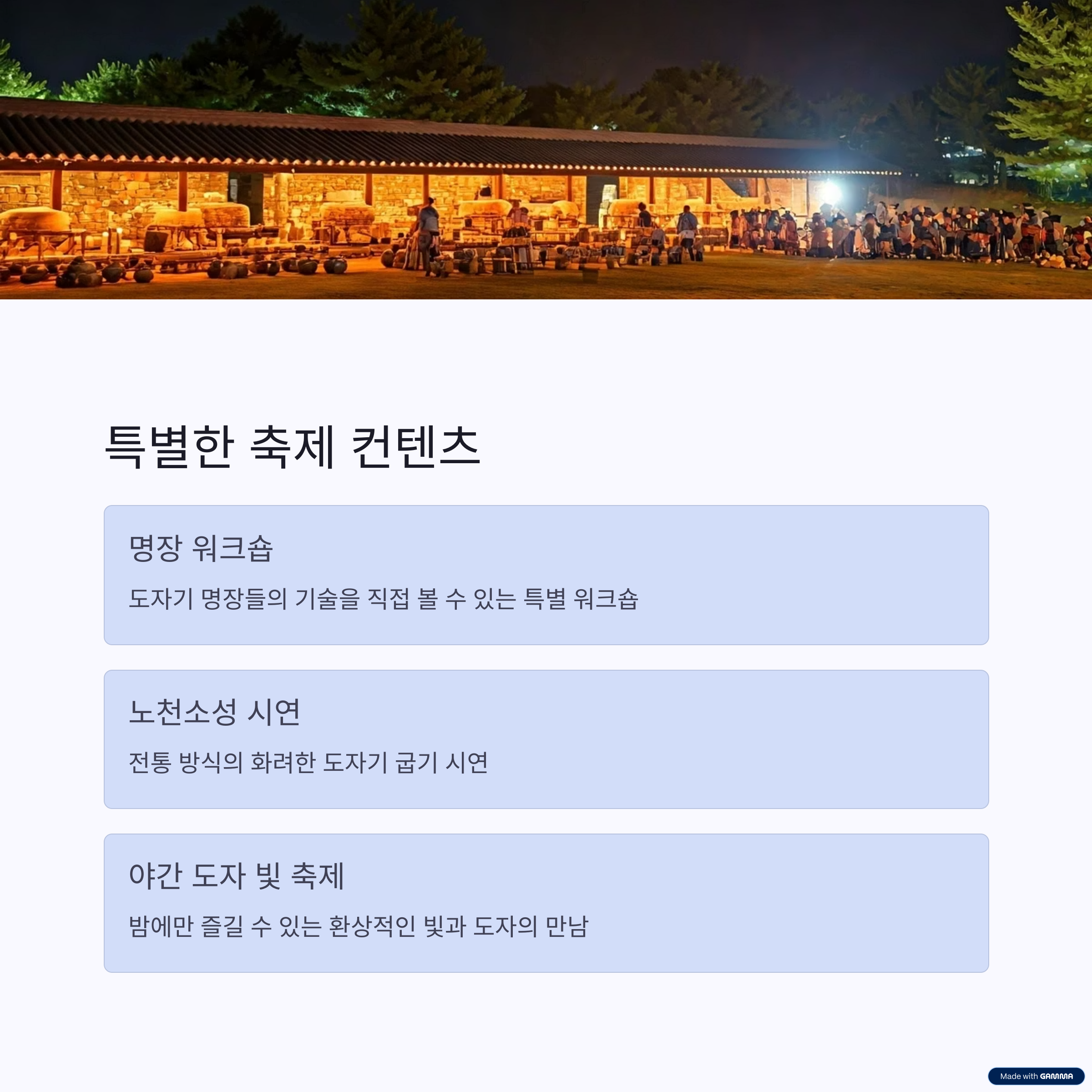 - 포토존: 빛나는 도자기 정원, LED 터널, 라이트 퍼포먼스